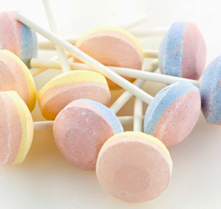 Hard, chalky lollipops with two fruit flavors and colors on a single stick.