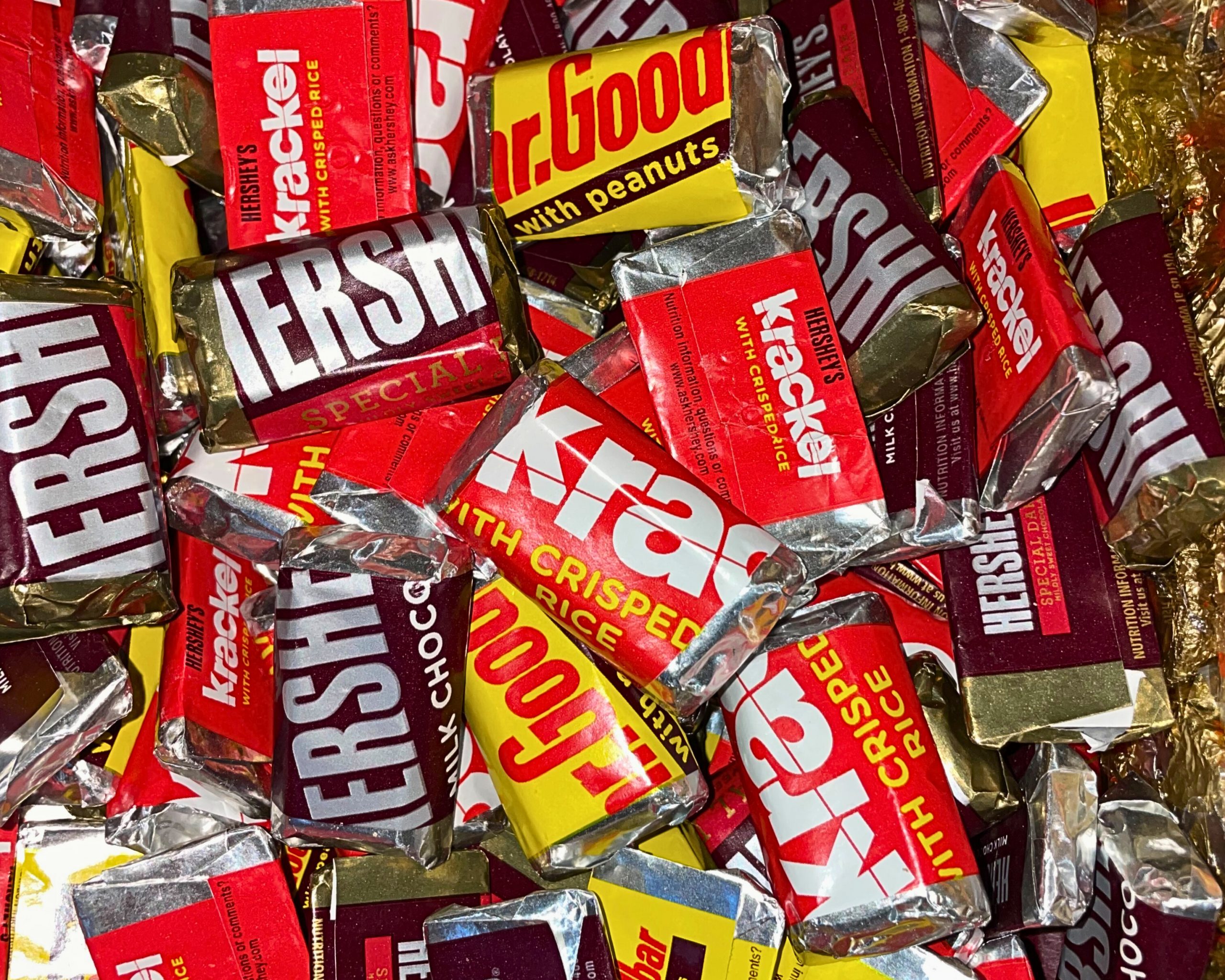 Mini bite-sized pieces of these classic chocolate bars: Hershey Milk Chocolate Bar, Hershey Special Dark Chocolate Bar, Krackel, and Mr. Goodbar!