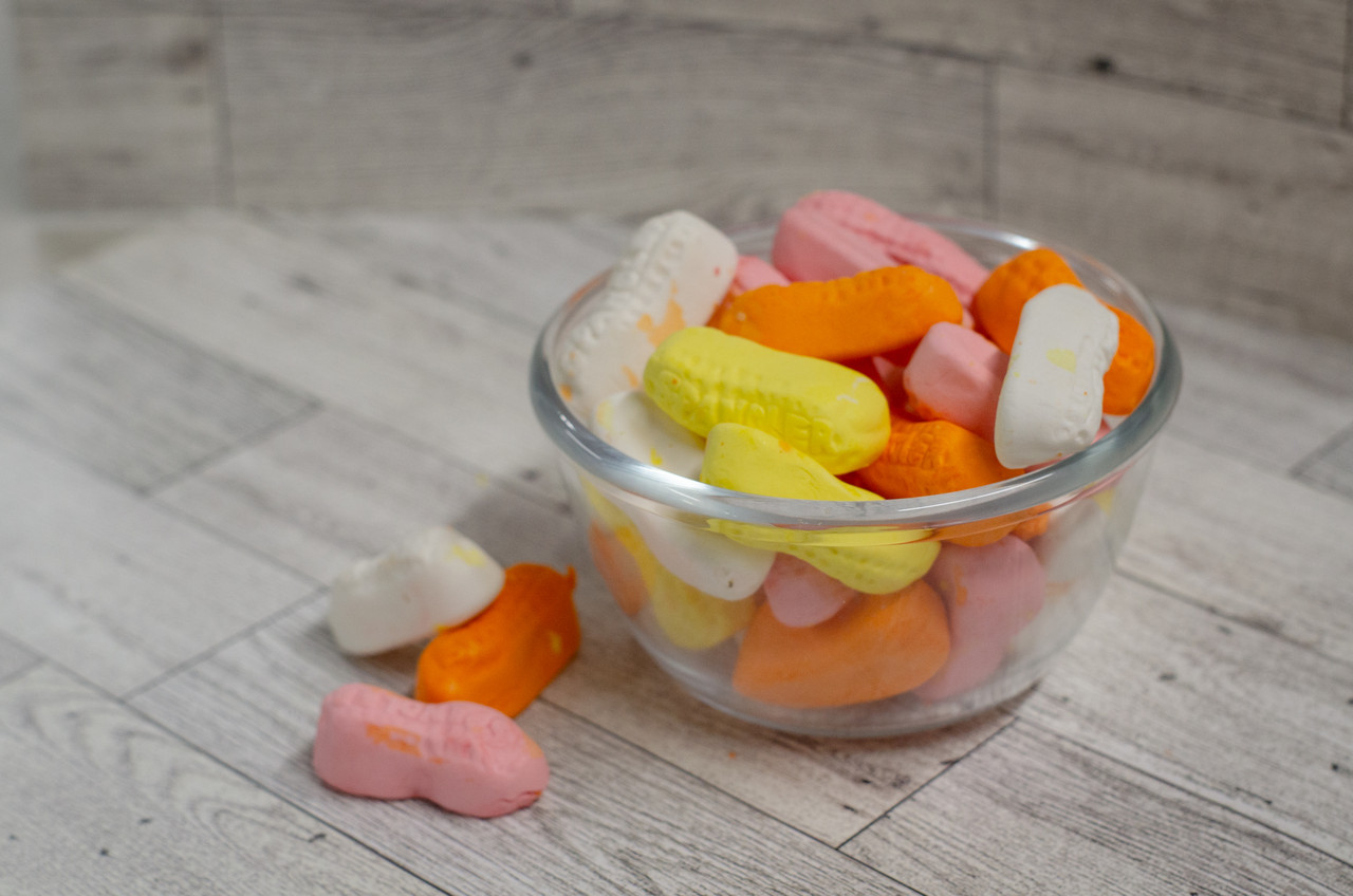 Fluffy and fat-free, our Assorted Marshmallow Peanuts are an old-time favorite. Flavors include vanilla (white), cherry (pink), banana (orange) and lemon (yellow). Yes, these are the official Marshmallow Peanuts used in a variety of cooking recipes. Make great cake and cupcake toppings!