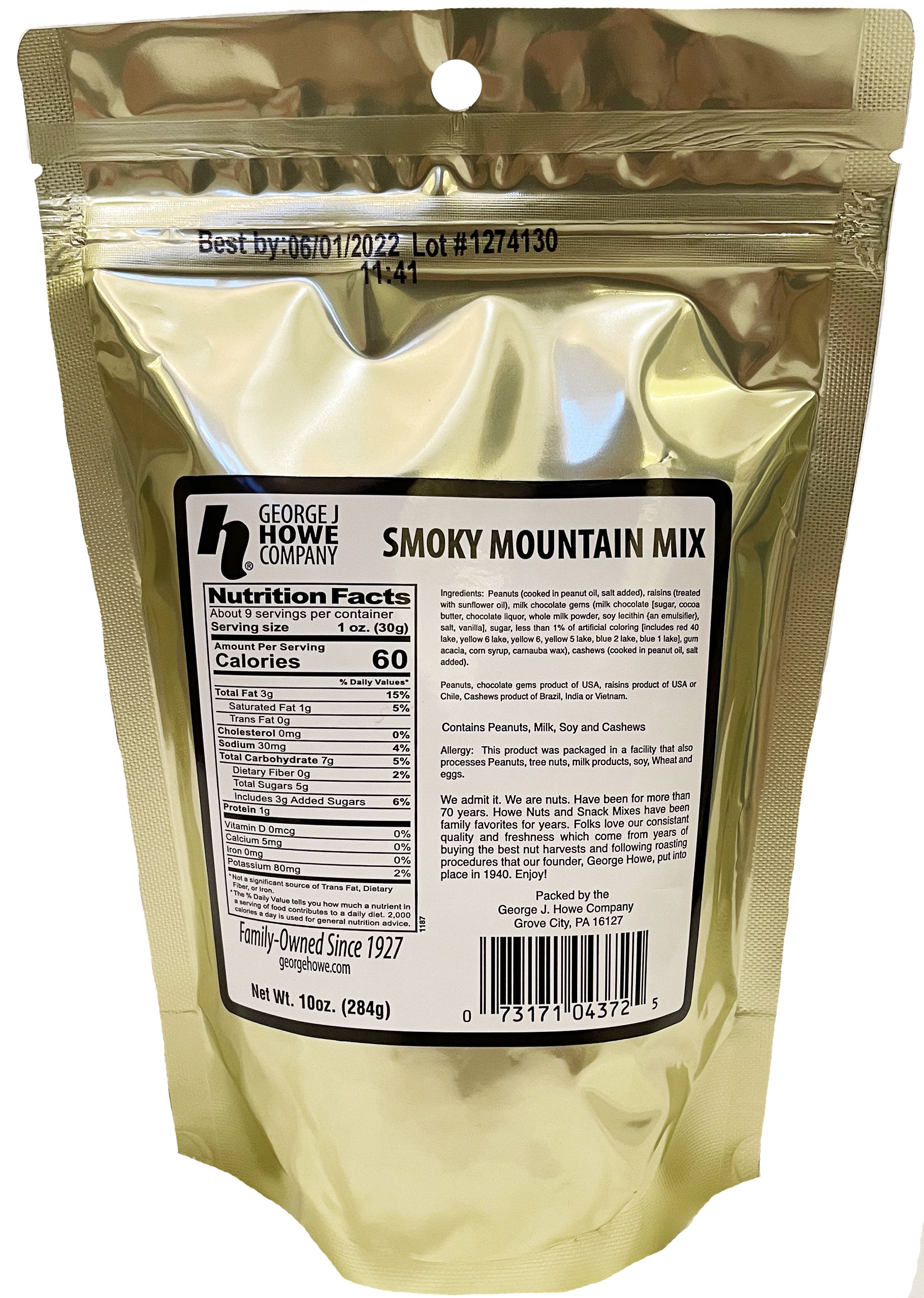 All of your taste buds come into play with this snack mix. We start with fresh-roasted peanuts, add delicious cashew pieces, mix in sweet juicy raisins and then kick it up a notch with those irresistible chocolate buttons. It’s the perfect snack for whatever you need! Howe Smoky Mountain Mix is the perfect snack mix for a long road trip or to take on a hike. Get yourself a bag today!